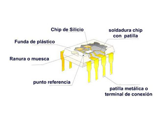 El pequeño chip de silicio de un circuito integrado, está instalado dentro de una funda de plástico y