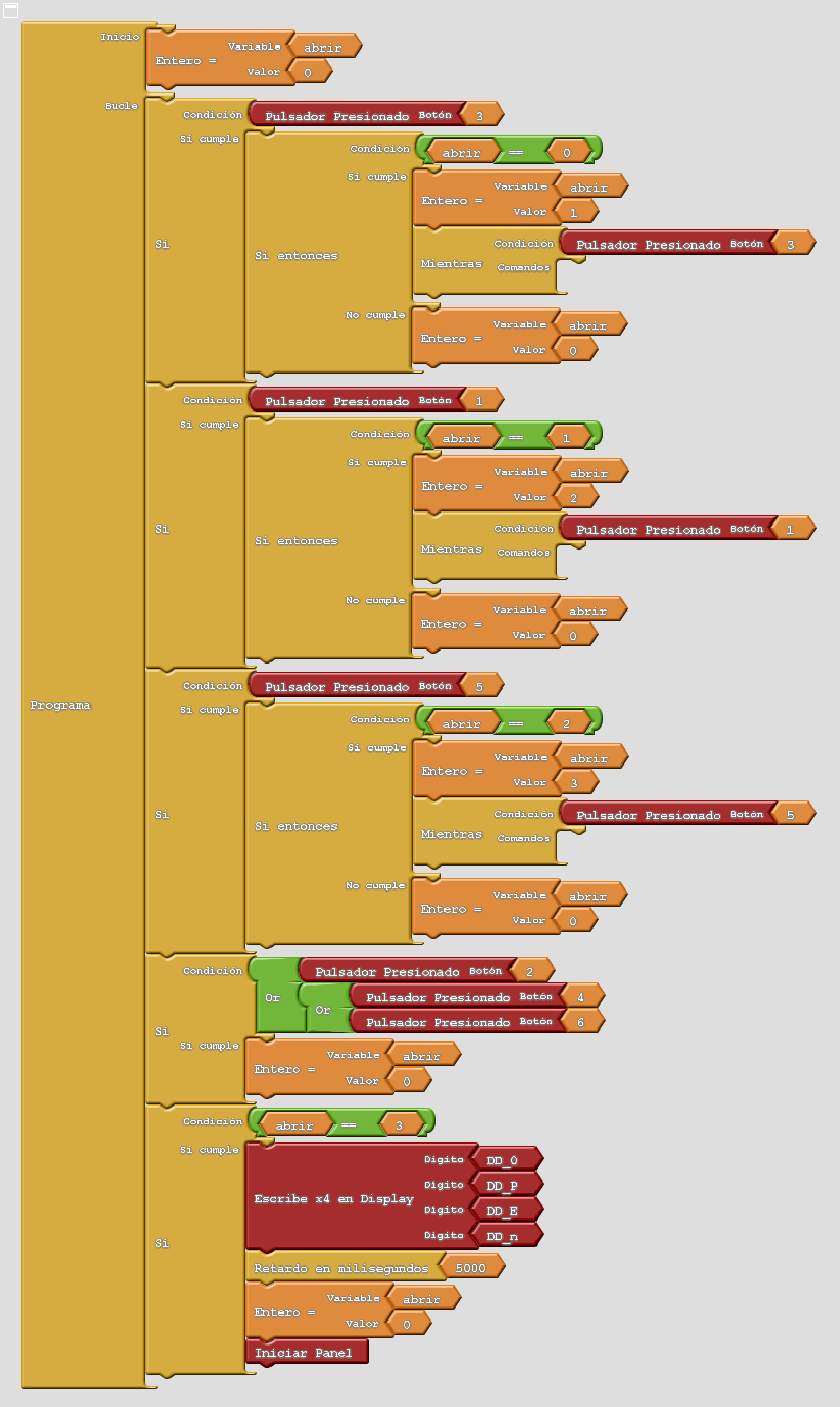 Electronic lock. Copy the following program that simulates an electronic lock. By pressing the sequence of buttons 3, 1 and 5 in order, an electronic lock will open. The opening is indicated by the word OPEN on the display.