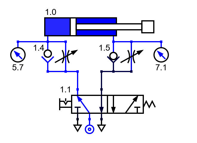 Simulate in the following simulator the slow movements of the double-acting cylinder with air outlet restricted by a regulating valve. Remember to press the 's' key to make the simulation progress step by step: