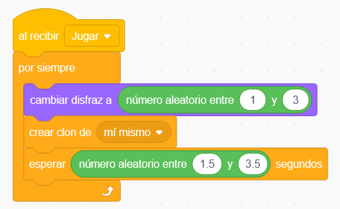 Upon receiving the Play message, the code will begin to create clones of the trees in a random costume. Between one clone and another we will wait a random time between 1.5 and 3.5 seconds.