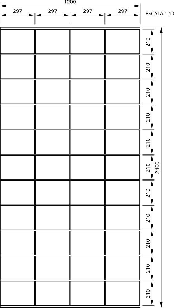 De un tablero estándar de 240x120 cm se pueden conseguir fácilmente 44 tablas de tamaño DIN A4. Para facilitar el pedido en un centro de corte de tableros se adjunta un plano de corte de las tablas, con las dimensiones ya acotadas: