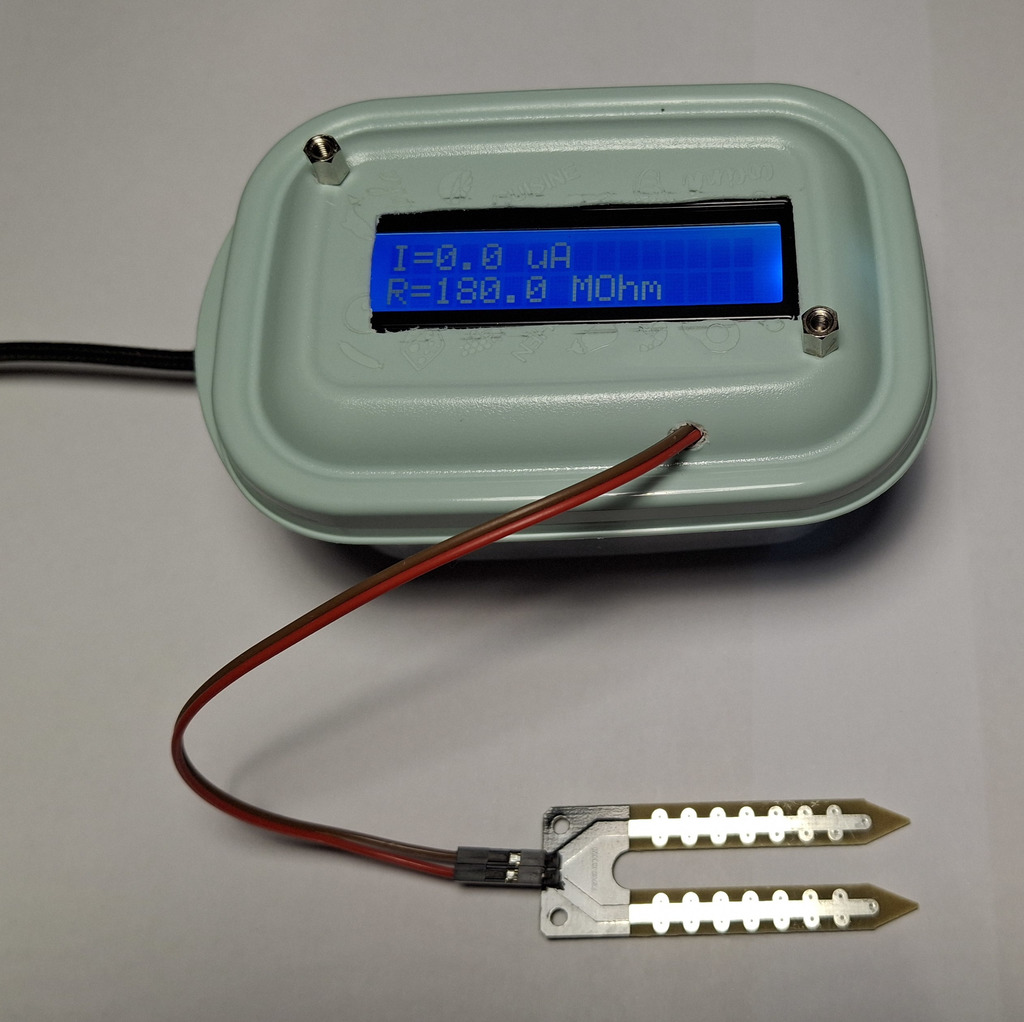 Conductímetro basado en Arduino sin resistencia en el sensor. La medición muestra una resistencia mayor de 180 megaohmios.¶