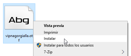 Fuente de texto Vipnagorgialla boldUna vez descargadas, podemos instalarlas pinchando sobre cada uno de los archivos con el botón derecho del ratón y seleccionando instalar.