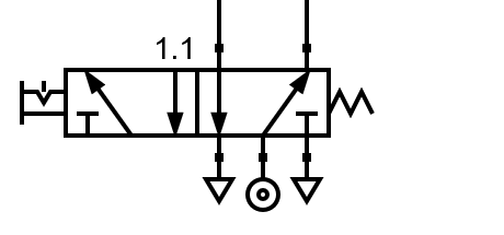 Las tres vías de la parte inferior se conectan a la fuente de presión (vía de en medio) y a los escapes a la izquierda y a la derecha. Las dos vías superiores se utilizan para llevar aire a dos lugares distintos o para retirar ese aire durante el reposo. Esta válvula está pensada para pilotar cilindros de dos vías que veremos más adelante.